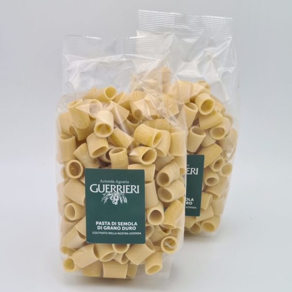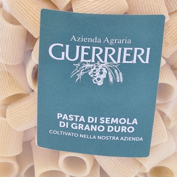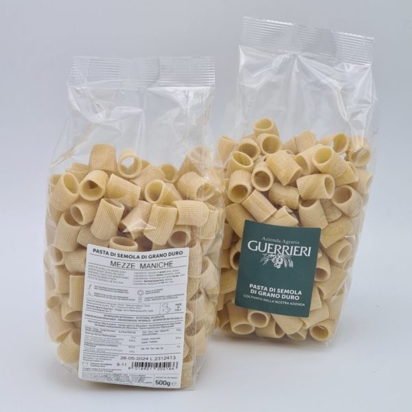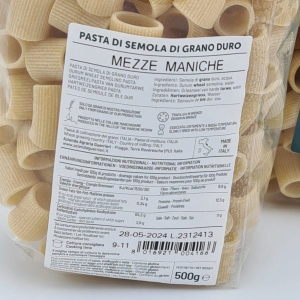 Mezze maniche trafilato in bronzo, is een hele mooie traditionele pasta. De pasta draagt deze naam omdat de kleine gedrongen ringen op halve mouwen lijken (dit is de letterlijke vertaling. De pasta wordt op traditionele wijze geproduceerd door een agriturismo in Le Marche. Dit betekent dat de pasta door een bronzen mal gespoten, waardoor er een ruw oppervlak ontstaat op de pasta. Dit ruw oppervlak zorgt er weer voor dat de saus veel beter aan de pasta blijft plakken. Trafilato in bronzo betekend dus door brons getrokken/gespoten. Dus pasta’s trafilato in bronzo zijn een ideale pasta’s voor rijke sauzen. De agriturismo, Guerrieri, die deze Mezzi Maniche produceert levert ons ook verschillende top wijnen. Naast de Mezze Maniche pasta voeren we ook de Bucatini van Guerrieri.