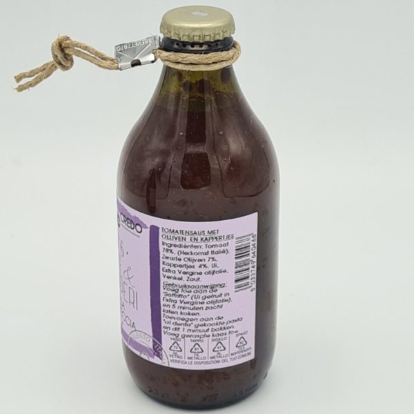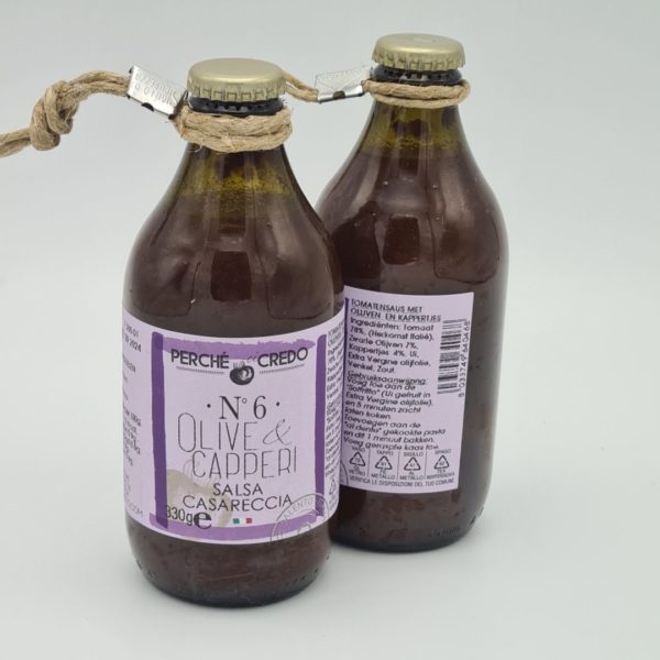 Deze Salsa Olive e Capperi is een heerlijke smaakvolle kant en klare pastasaus van Perche ci Credo. Deze fijne tomatensaus is verrijkt met aangefruite uit zwarte olijven, kappertjes, venkel zout en olijfolie. De Saus is direct te gebruiken op een mooie pasta, maar je kunt er natuurlijk ook je eigen draai aangeven. Probeer het eens met wat extra aangefruite ui en ansjovis, daarna de pasta saus toevoegen en op een laag vuur even 5 minuten late pruttelen. En voeg eventueel een scheutje balsamico azijn toe. En je hebt snel een geweldig pasta gerecht gemaakt. Deze pastasaus komt uit de regio Puglia, provincie Lecce.