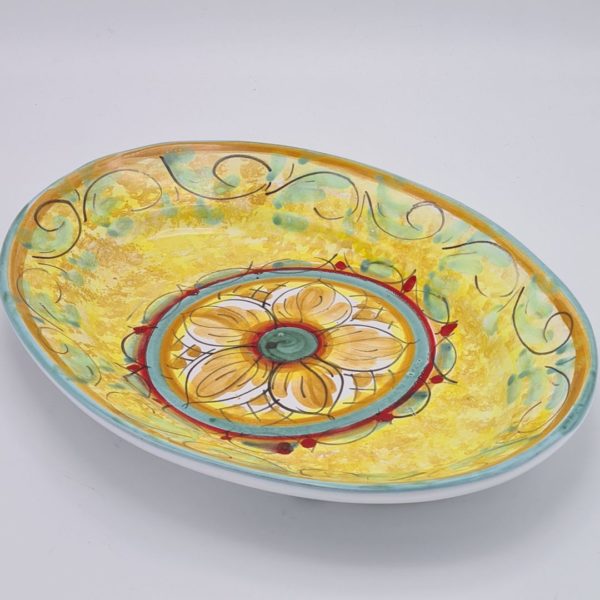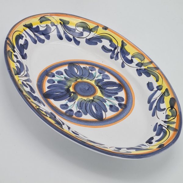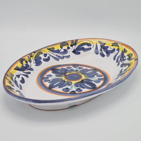 Er komt voor prachtig keramiek uit Sicilie, denk daarbij alleen al aan de bijzondere en kleurrijke keramieken hoofden. Dit stuk Siciliaans keramiek is een prachtige handgemaakte en beschilderde schaal. Met de lengte van 35 cm is de keramieken schaal ideaal voor het presenteren van een mooi gerecht. Uiteraard kun je het ook als een decoratief stuk in de kast zetten. Maar dat vind ik eigenlijk zonde. Let op, het is dus een uniek stuk.