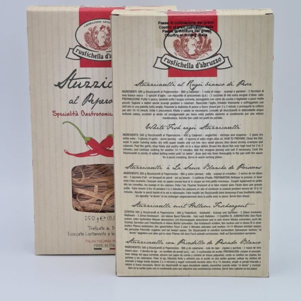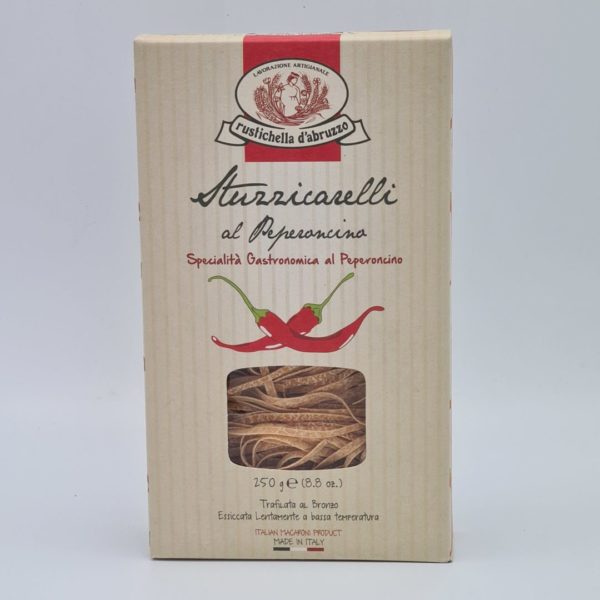 Deze heerlijke Stuzzicarelli pasta komt uit de regio Abruzzo, een van de mooiste natuurregio’s van Italië. Een heerlijke lint pasta die te vergelijken is met tagliatelle. De pasta wordt gemaakt door Rustichella d’Abruzzo. Een producent van vele traditionele pasta’s. De meeste pasta zijn gemaakt van Semola di grana duro. Zo ook deze Stuzzicarelli met toegevoegde peperoncino.